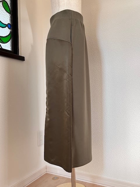 前後にレザー調の異素材で切り替え、サイドには配色ラインが入ったタイトスカートです。