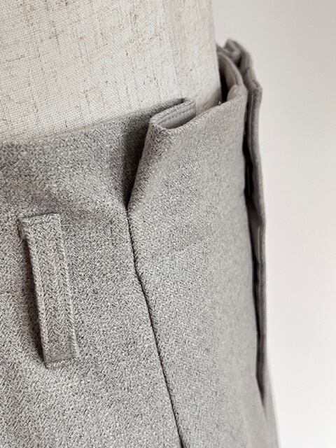 表にファスナーやボタンなどがみえないスッキリ見えする比翼仕立て。