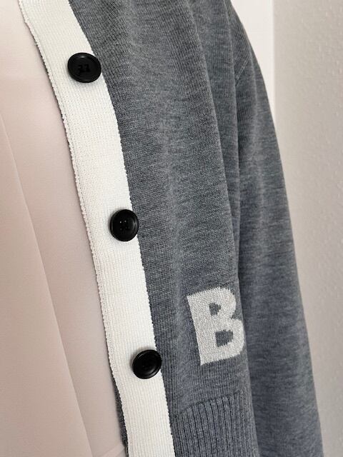 ベージュはゴールド、グレーはシルバーの配色ラメ糸のブランドロゴが印象的な一着です。
